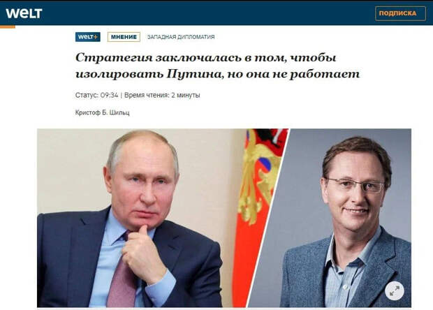 Die Welt написали статью "Стратегия заключалась в том, чтобы изолировать Путина, но она не работает"